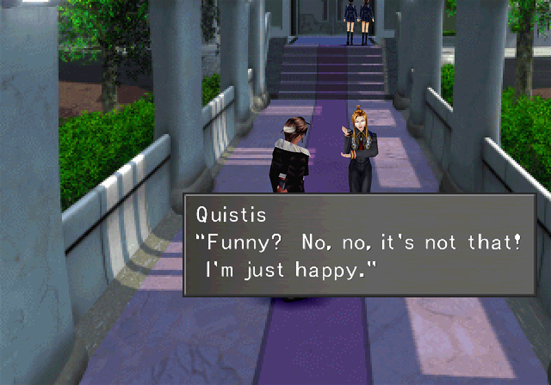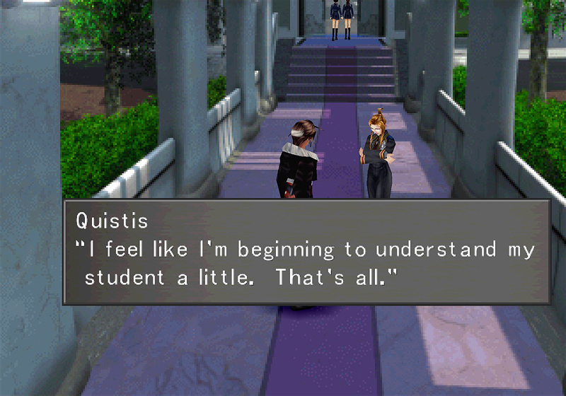 One of the most important things about Squall's character — and one I think often gets forgotten — is that he's a seventeen-year-old kid. He can think he's complex as he wants, but when it comes down to it he's not fooling anybody. Quistis genuinely wants to get to know him better, even as Squall pushes her away, because past the cool, aloof exterior he puts up, she sees someone she likes.