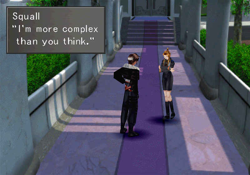 Indeed, much of the first few hours of the game emphasize these aspects of Squall's personality. He's a loner. He only puts up with other people as much as he has to. As FFVIII is an RPG, the player is often given choices for Squall's behavior, such as showing a new student around Balamb Garden or ignoring her and continuing on his way. The former, of course, serves as a tutorial for the player, but it's important to note that whenever these choices come up Squall can stay true to form and brush people off.