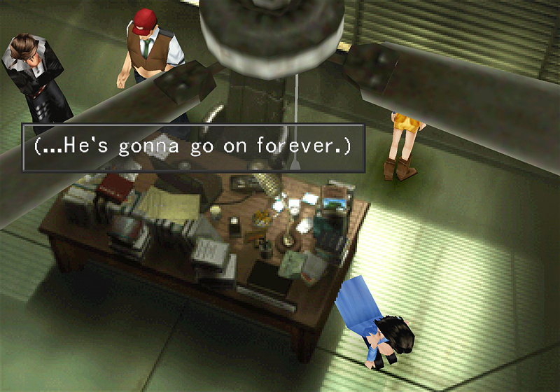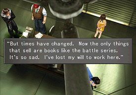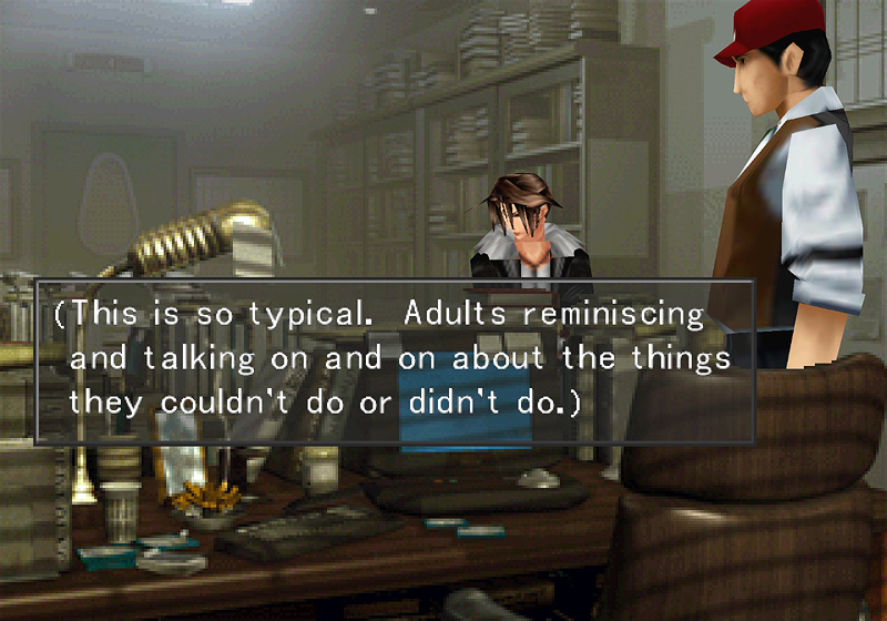 This is an entirely optional conversation with the editor of the Timber Maniacs, but I think it says a lot about Squall's mindset. What Squall hates is the idea of growing up and becoming anything like the adults he sees around him. All of the conversations he can have with this guy have the same theme — the guy goes on about how things were so much better in The Good Old Days, and all Squall sees is someone who's past his prime and can't let go.