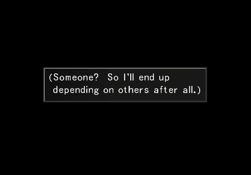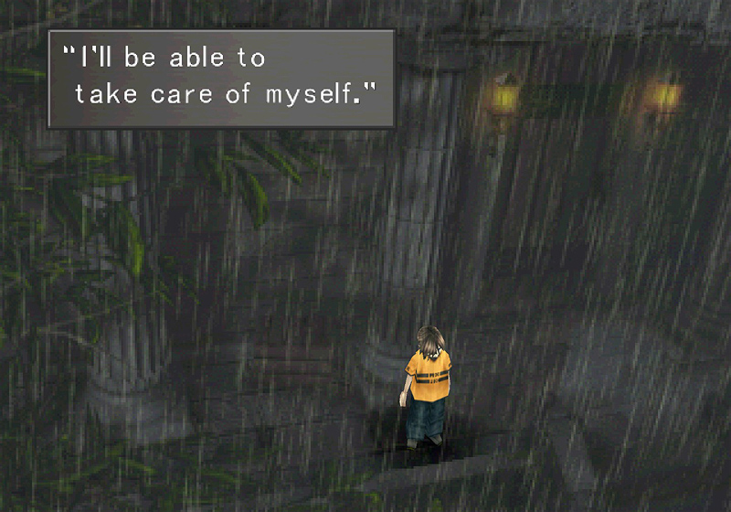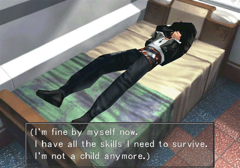 One of the biggest themes of this game is adolescence (lost childhood, childhood dreams, teenage love, and so on), and Squall is right on the cusp of childhood and adulthood. As a SeeD, he has learned how to take care of himself, and it’s likely that he thinks of those skills here. But that’s not what he really means. He can have all the knowledge in the world, but even if he’s not ready to admit it to himself, he knows he can’t survive by himself. He’s the first to admit that he’s made it this far because of other people. He pushes them away, yes, but he’s not ignorant of them.