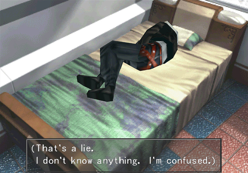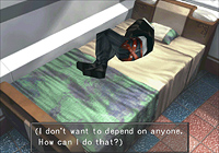 The reason I bring it up now is because for the entirety of Disc 2, whenever Squall can, he retreats to his room and curls up on his bed. That's where most of his scene-changing monologues take place. It's where he feels safest, away from the rest of the world, everyone who wants something from him. He bends into the fetal position, trying to protect himself from the outside world as much as possible, and in this scene in particular we see him start out lying on his back and curl up on himself as he keeps thinking.
