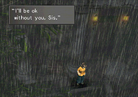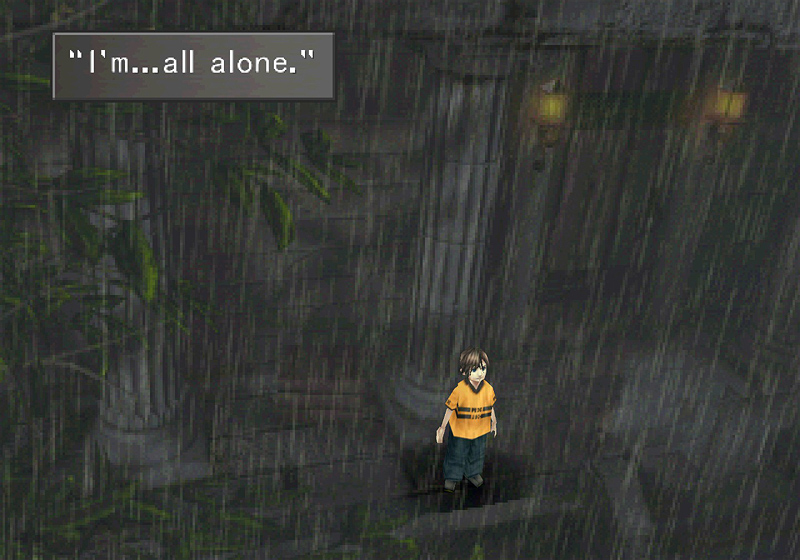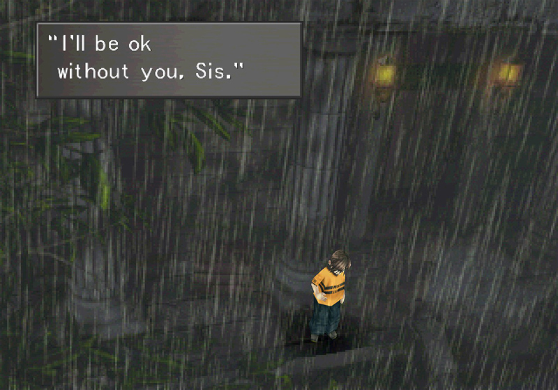 It's a really powerful image, and drives home the point that Squall is a child. No matter what he wants for himself, or what's expected from him, he's still just a kid with a lot of trauma he needs to work through. And that's the other thing: this is the first time we see just what happened to him. We see a little boy in the rain, calling out for his sister.