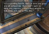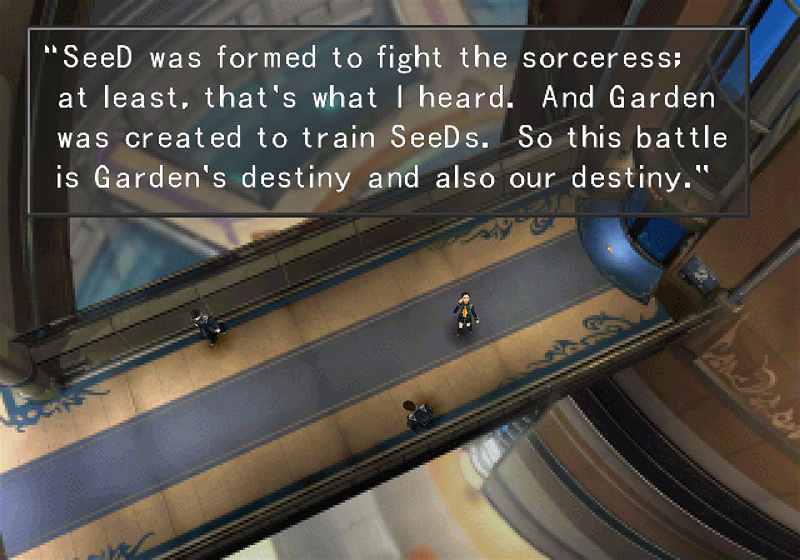 Is this really Squall? Our Squall? Squall "go talk to a wall" Leonhart? Yes, yes it is. He's already grown a lot through the game, and we've still got a good ways to go. I think it's very important to note that while Squall can give a speech like this to the entire school, that doesn't mean he's anywhere near ready to say the same kinds of things one-on-one. Like I said above, this whole part is written like a final dungeon/boss battle sequence despite the fact that we're only on disc two, and Squall's got the energy to go with it. He thinks that he's making the final push, and he's doing his duty as a leader. That's still very different from being a friend.