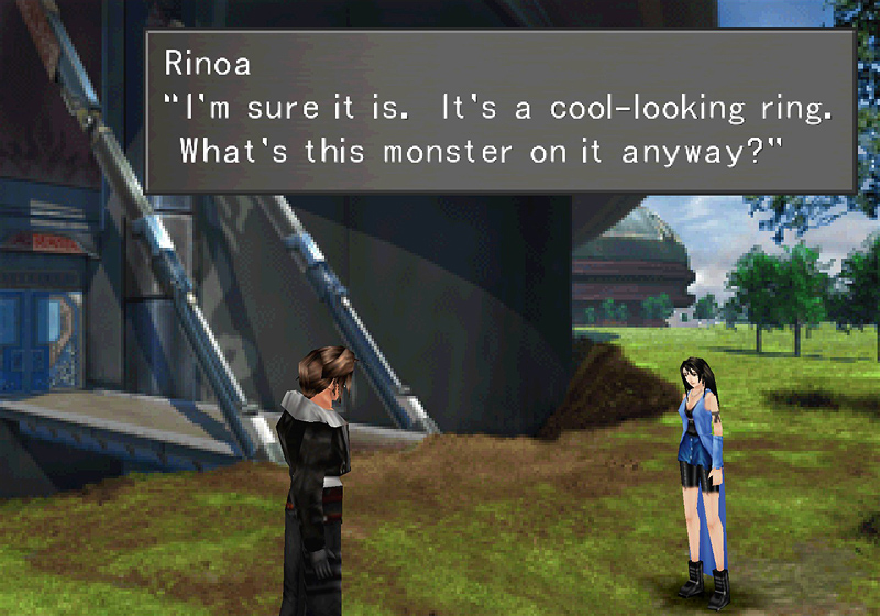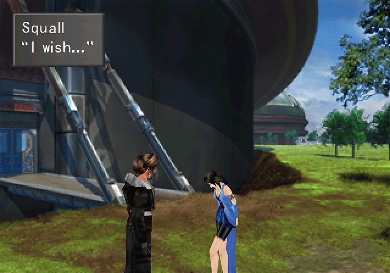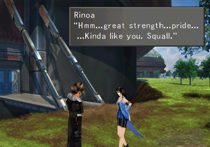 Squall clearly isn’t sure what to think about the fact that everyone is pushing him and Rinoa together, but he doesn’t protest the idea that she could become like a lion too. Slowly but surely, he’s opening up to her, and through something that means the world to him, no less: Griever.