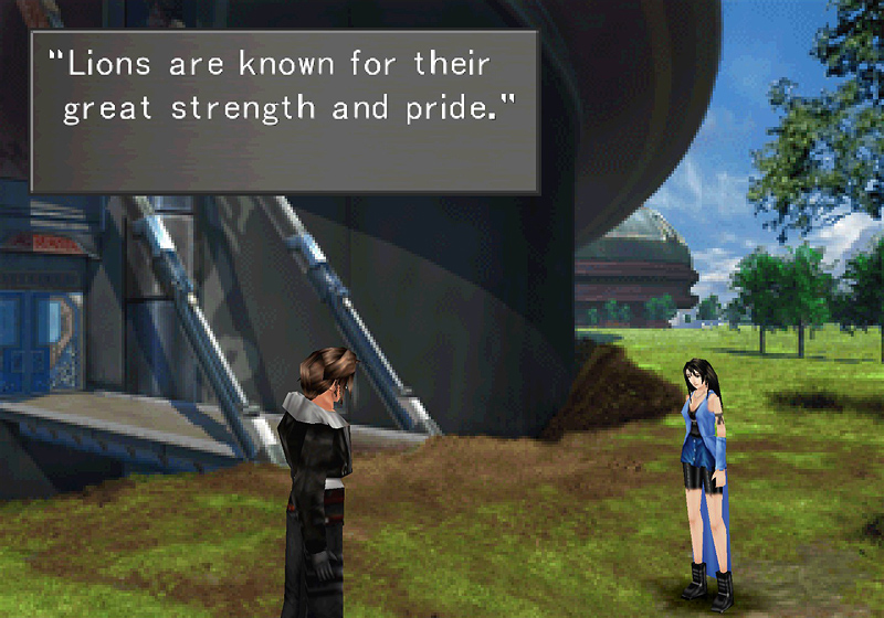 In any case, lions exist in some shape or form in FFVIII, even if we never see them outside of Squall's pendant. Maybe they went extinct after the Lunar Cry, or maybe they're mythical beasts. Seriously, this is the kind of thing I've always wondered about RPGs. Where the hell are all the animals. (I wonder this about Pokémon too, to be fair.)